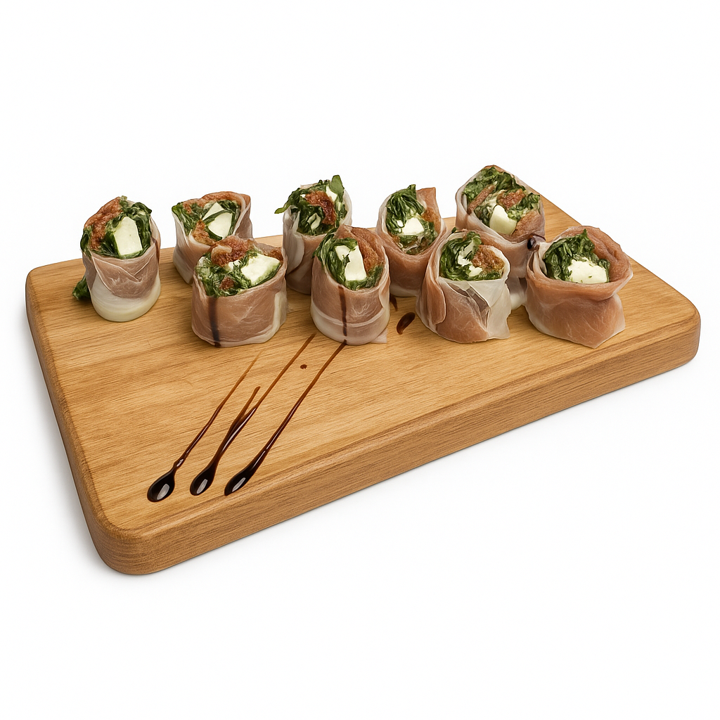 прошуто, рукола, сушен домат, прясна моцарела, краставица, песто дженовезе, мус от сирена и балсамова редукция /