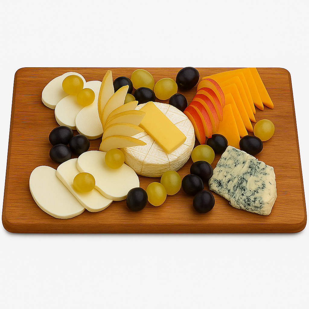синьо сирене,чедър,камемберг,прясна моцарела,сезонни плодове